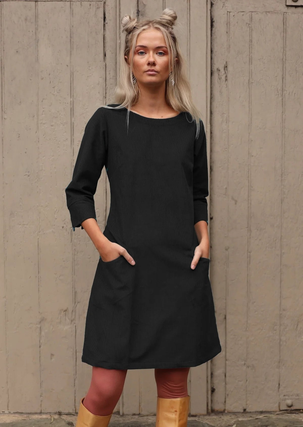 This is a must have for the season. This black 100% cotton corduroy dress includes the most important feature, pockets!! Also features a nice, wide round neck line, an aline skirt and stylish detail on the cuffs. Perfectly put together with leggings and a pair of boots or a pair of flats for those in-between seasons.
